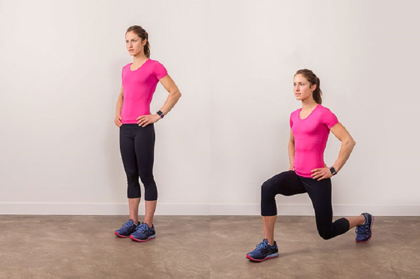 Con las manos en las caderas das una zancada con el pie derecho hacia adelante y mantienes los abdominales apretados con el pecho en posición vertical. Bajas al piso mantienes la posición durante 10 segundos y luego regresas a la posición inicial. Cambias ahora con el pie izquierdo y repites. Hacer 5 repeticiones con cada pie. Este ejercicio mejora el control de todo el cuerpo, por lo que ayuda a fortalecer los músculos de la espalda.