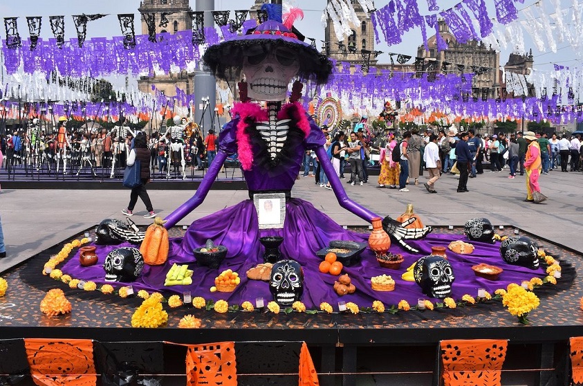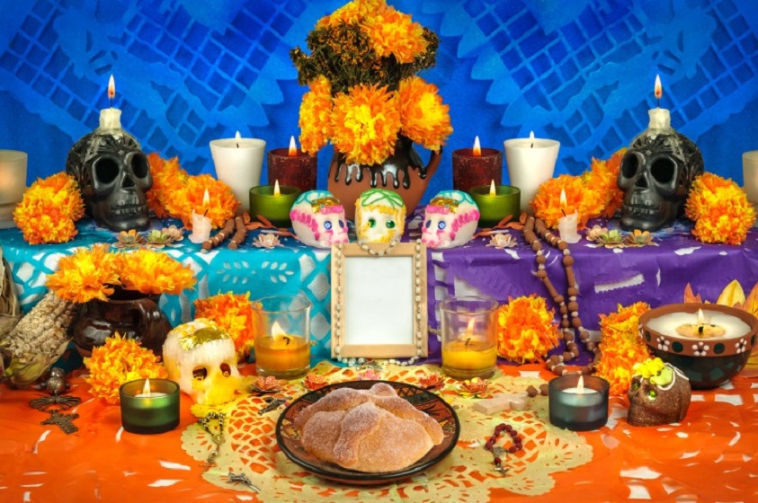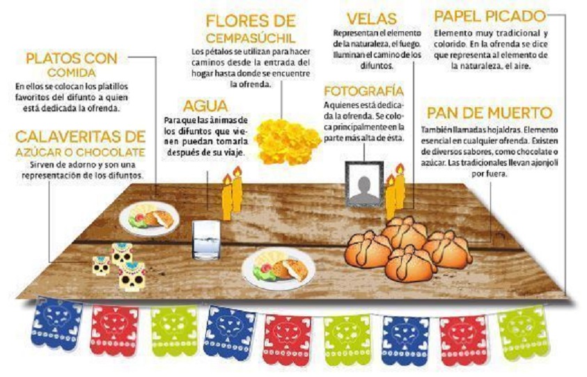 Las calaveritas, la catrina, el pan de muertos, el papel picado, el incienso y la flor de cempasúcil son los protagonistas junto con la comida y bebida tradicionales.