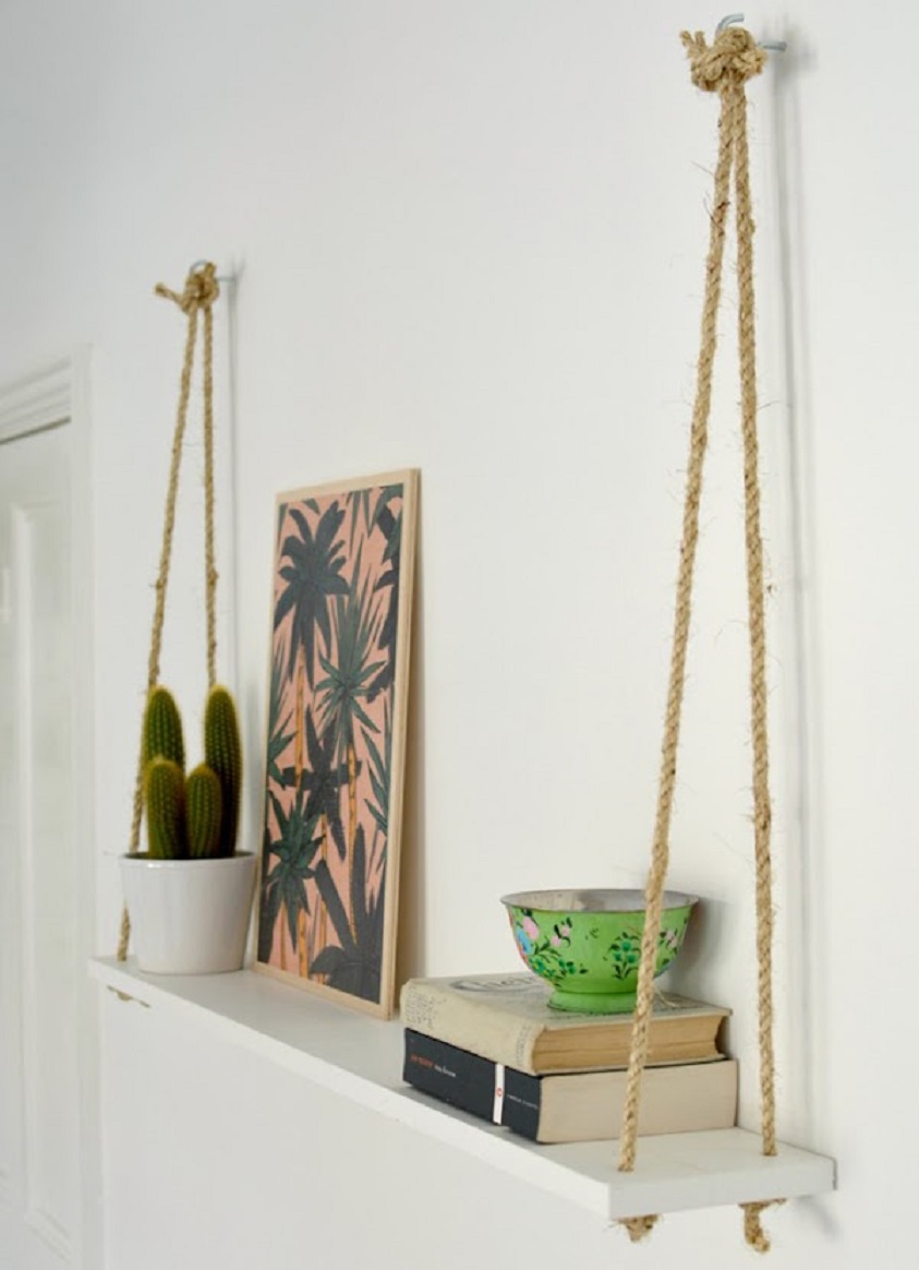 Esta repisa es una manera bonita de darle un aspecto original a cualquier espacio de la casa donde se quiera colocar. En lugar de colocarla de la manera habitual, lo hacemos con un par de cuerdas y el resultado es totalmente diferente y espectacular.