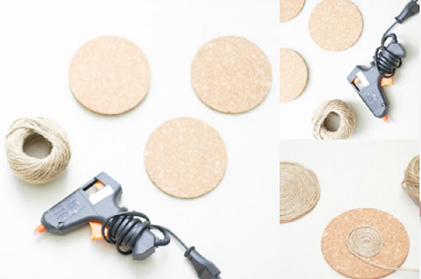 - Poner un poco de silicón en el centro y rodear el círculo de corcho con la cuerda a la vez que se agrega silicón por toda la superficie y se va poniendo la cuerda. Cortar la cuerda al final cuando se haya cubierto el círculo.