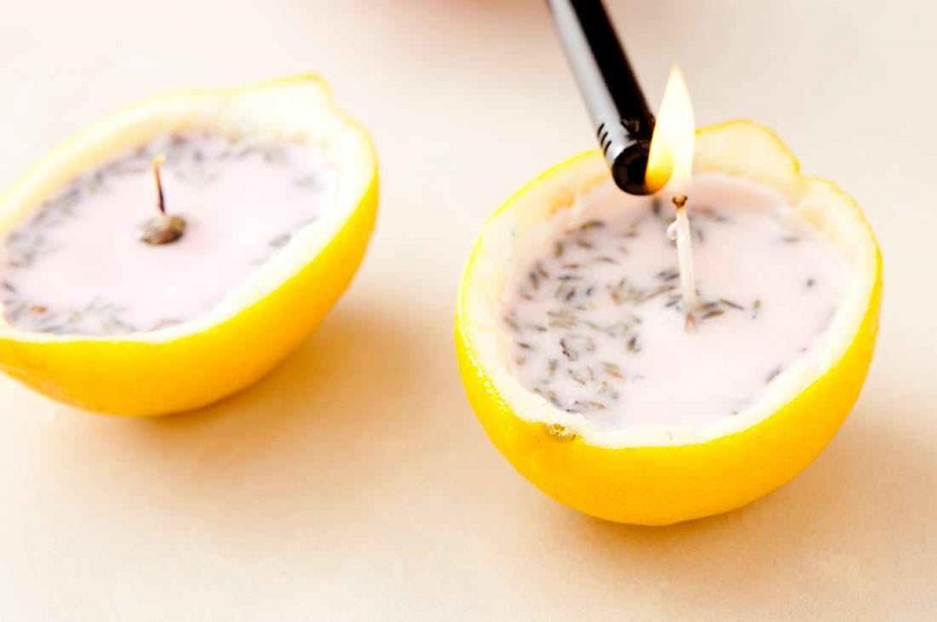 Las velas con aromas frutales y frescos dan una sensación de limpieza y bienestar incomparables en donde quiera que las pongas. Estas velas con fragancia a lavanda se hicieron en cáscaras de limón, también se pueden usar de naranja o toronja.