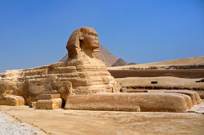 La Gran Esfinge de Guiza es una monumental escultura que se encuentra en la ribera occidental del río Nilo, en la ciudad de Guiza. Los egiptólogos estiman que fue esculpida por el siglo XXVI a. C., formando parte del complejo funerario del rey, durante la dinastía IV de Egipto. La Gran Esfinge se realizó esculpiendo un montículo de roca caliza situado en la meseta de Guiza. Tiene una altura de unos veinte metros aproximadamente, y unos 70 de longitud. La cabeza podría representar al faraón Kefrén, teniendo el cuerpo la forma de un león. En épocas antiguas estaba pintada en vivos colores: rojo el cuerpo y la cara, y el neme que cubría la cabeza con rayas amarillas y azules.